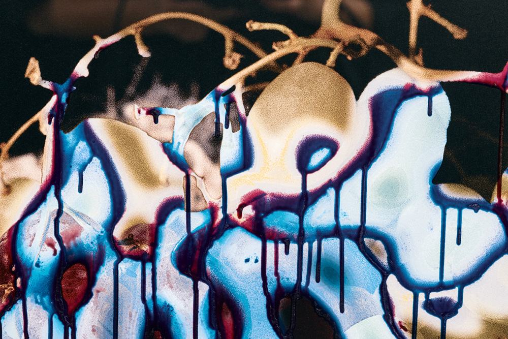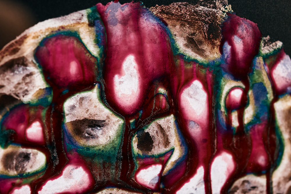 Mais une autre forme de temporalité — le son — est superposée à cette image. Ce son, collecté dans le même espace, est visualisé sous forme de sonogramme. Ces sonogrammes deviennent des figures sonores, suspendues comme des glyphes ou des formes sculpturales, déposées silencieusement dans la composition. Et ensuite, de l’encre UV est versée.