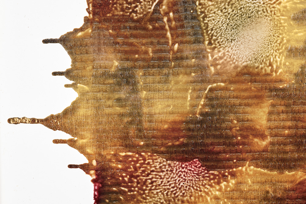 À l’origine basées sur des images photographiques, ces œuvres subissent un processus délibéré de destruction et de déstabilisation lors de l’impression.