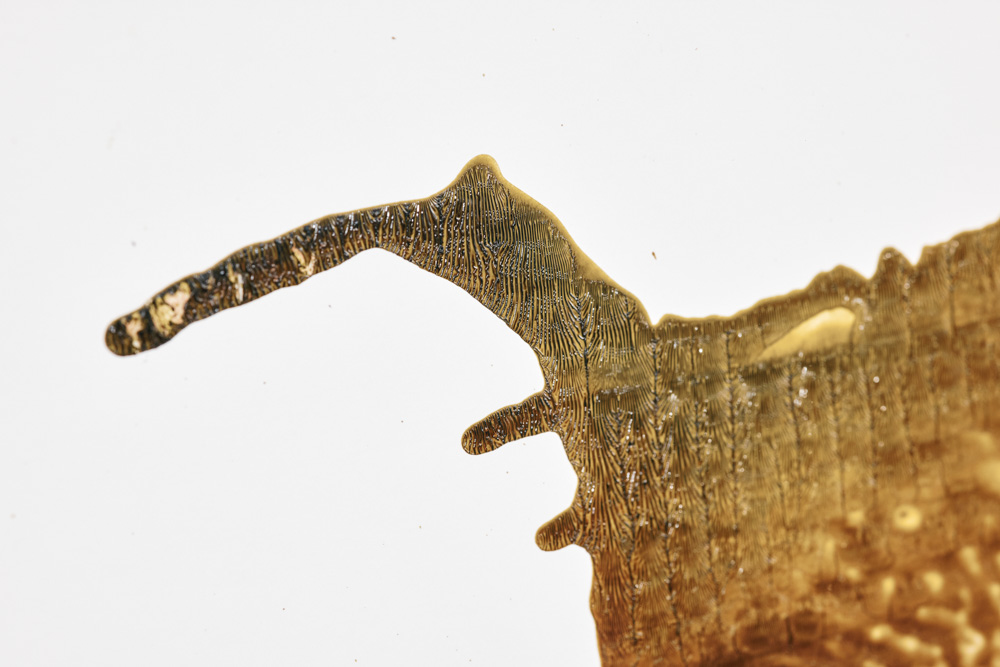 L’encre reste non fixée, autorisée à couler, à se brouiller, à s’écailler — oblitérant la lisibilité des formes et rendant l’image illisible en tant que référent.